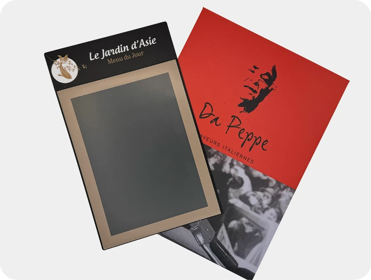 Affichez clairement vos plats, boissons ou formules grâce à un porte menu restaurant aussi pratique qu’élégant. Optez pour une impression menu professionnelle et durable : que ce soit pour renouveler vos supports ou créer une ambiance cohérente dans votre salle, nous avons la solution.