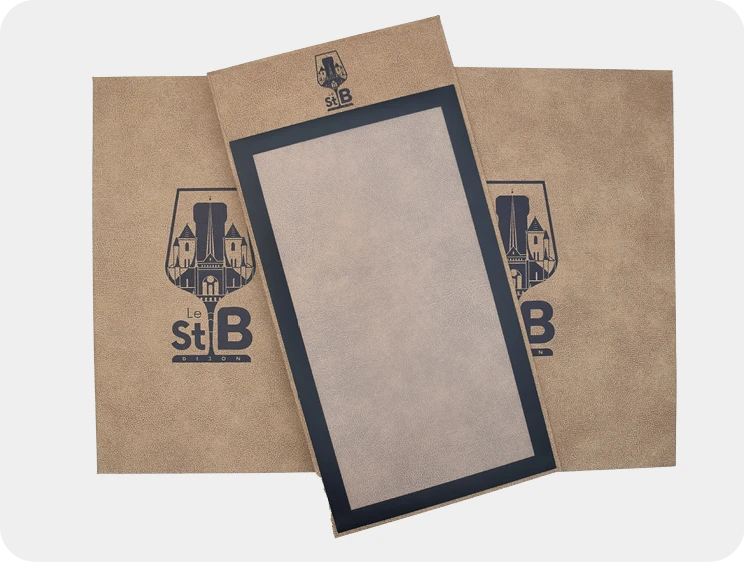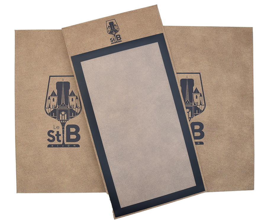 Nous proposons une grande variété de matières et de finitions pour s’adapter à l’ambiance de votre restaurant. Que ce soit du simili cuir, de l’effet liège, bois,… ou d’autres matériaux innovants, chaque détail compte pour offrir une présentation impeccable. En plus de mettre en valeur votre établissement, le Menu Matière est très résistant. En voici quelques exemples…