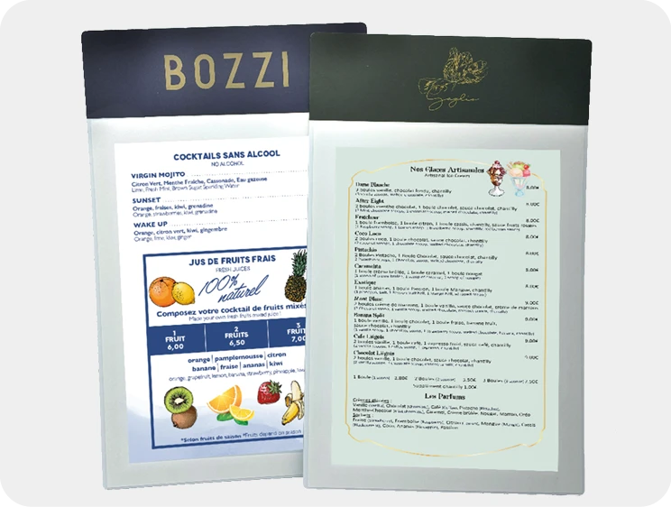 Le Recto/Verso, idéal pour compléter votre carte principale avec votre carte des boissons, des vins, des cocktails, des tapas, …